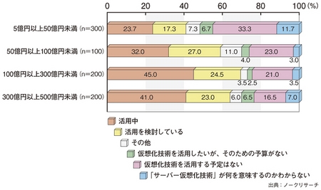SMBの間でサーバー仮想化の導入意欲が高まっている。ノークリサーチは、年商5億円以上500億円未満のSMBに対して、サーバー環境の実態と展望に関する調査を実施した。そのなかでサーバー仮想化の活用状況をたずねた結果では、「活用中」2~4割、「活用を検討している」を含めると4~6割に達している。