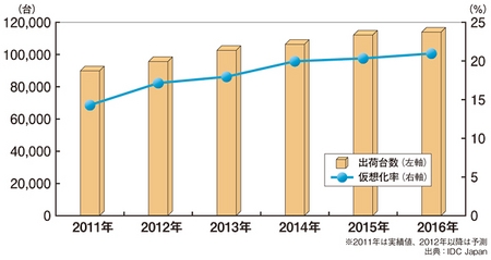 しかし2012年は、07年前後に仮想化環境の構築に向けてx86サーバーを導入したユーザー企業のリプレースが活発化することでプラス成長になるとみる。2016年の国内仮想化サーバー市場の出荷台数を11万3468台と予測している。また、サーバー市場のなかでの仮想化サーバー率は2016年には20.9%になるとみており、2011年の14.4%から6.5ポイント伸びるという。