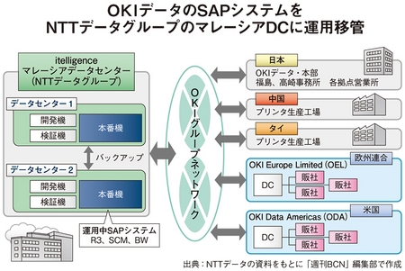 第一弾として、2011年12月、OKIのプリンタ事業を担っているOKIデータ(平本隆夫社長)が、NTTデータグループの独itelligenceがもつマレーシアのDC経由で提供する「INERPIA/イナーピア SAPホスティングサービス」の活用に向けて検討を始めた。本稼働にこぎ着けたのは今年5月だ。2013年度(14年3月期)までに、日本やアジア圏各拠点におけるDC運用コストを2010年度比20%以上削減し、運用品質・効率の向上、事業継続性リスクの軽減を目指している。