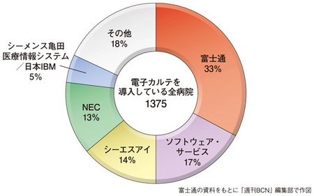電子カルテのシェアは、富士通がトップに立つ。2010年時点の全病院約8600か所のうち、電子カルテを導入している病院数は1375か所。富士通の調べによれば、富士通が33%、ソフトウェア・サービスが17%、シーエスアイが14%、NECが13%のシェアを占める。富士通やNECなどの大手コンピュータメーカーは大手病院に強く、ソフトウェア・サービスは中堅・中小病院に強い。診療所の電子カルテの状況をみると、パナソニックグループ(三洋電機)やダイナミクス、ビー・エム・エル、ラボテック、富士通などが上位に名前を連ねる。診療所は全国約10万か所と、数は多いものの、大病院に比べて電子カルテ導入の投資対効果に限りがある。また、事業規模そのものも小さいので、導入時のシステム単価は自ずとコストパフォーマンスにすぐれた製品を求める傾向がある。JAHISでは2015年の診療所の普及率を44%程度と見込んでいるが、短期的には地域の中核病院のように100%近くまでに到達することはないとみられる。
