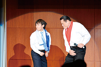 サイボウズが開催したカンファレンス「cybozu.comカンファレンスII」(9月27日)で、アントニオ猪木に闘魂を注入された同社の青野社長(左) 国産ソフト会社の任意団体、メイド・イン・ジャパン・ソフトウェア・コンソーシアム(MIJS)で、青野と活動をともにする1stホールディングス社長で、MIJS前理事長の内野弘幸も、変わる必要性を説く。内野は本筋を話す際、軽口を叩かずに言葉を選んで静かに語る。「国産ソフトは、日本市場特有の文化があり、外圧を受けない。だが、ここ数年のグローバル化が安穏としたポジションを脅かす」。