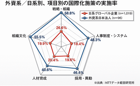 日系グローバル企業(日本企業)は、外資系日本法人に比べて国際化施策の全カテゴリで実施率が20ポイント以上低い。加えて、グローバルキャリア形成に向けて自社環境が望ましいと回答した割合が30ポイント強、下回る。法制度などのハード面と人材育成などのソフト面で、想像以上に外資系のほうが進んでいる実態が明らかになった。調査を通じて、三つの視点を提示している。「本社のグローバル化が遅れている」「役職の階層が上になればなるほどグローバル化の必要性は認識している」「優秀な人はグローバル化された環境で働きたいと思っている」。社員の志向や求められていることに対して、人事部門が行う施策が遅れていることがわかった。