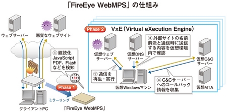 「FireEye」は、入口と出口の両方でシステムをサイバー脅威から守る機能をもっており、包括的な保護を実現する。マルウェアを即座に検出する仮想実行エンジン「VxE(Virtual eXecution Engine)」を搭載し、標的型攻撃を早期に検知することによって、システムの被害を防ぐ。