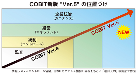 ITガバナンス(統治)のフレームワーク「COBIT」が7年ぶりに刷新される。COBITは「内部統制の強化」の標準フレームワークとしての採用が進んだ実績があり、今回は「内部統制」よりも範囲が広い「企業経営」や「企業ガバナンス」の領域を拡充している。新版である「COBITバージョン5」は11月8日に開催される「ITGI Japan カンファレンス 2012」以降、日本語版が順次投入される見込みだ。2005年以来、内部統制の強化では情報サービス業界で数百億円を超える波及効果があったとみられており、今回の新バージョンでは企業ガバナンス全体をITの側面から標準化していく需要開拓に役立つものと期待されている。(安藤章司)
