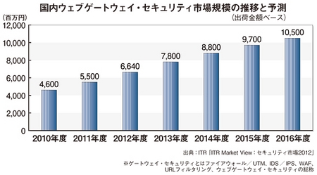 2011年度のウェブゲートウェイ・セキュリティの市場規模は55億円だった。URLフィルタリング市場が同年度52億円なので、規模はあまり変わらない。ただし、2016年度にはウェブゲートウェイ・セキュリティの市場規模が105億円にまで成長する一方で、URLフィルタリング市場は69億円となる見込み。ウェブゲートウェイ・セキュリティ市場は、2011年度から2016年度までのCAGR(年平均成長率)が13.8%と高く、CAGR13.5%のファイアウォール/UTM市場とともに市場全体の成長をけん引するだろう。