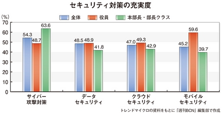 昨今の報道の影響からか、標的型攻撃の仕組みや手法を理解しているという比率は62.3%を占めたが、具体的な対策はできていないのが実態だ。重要度の高い情報は端末に保存できないようにしているという回答は24.8%に過ぎなかった。役職別にインシデント発生時の対策状況をたずねると、役員と本部長・部長クラスの間に大きな認識ギャップがあることが明らかになった。現場に近いほうが対策を認識しており、役員層への浸透度の低さが目立つ。