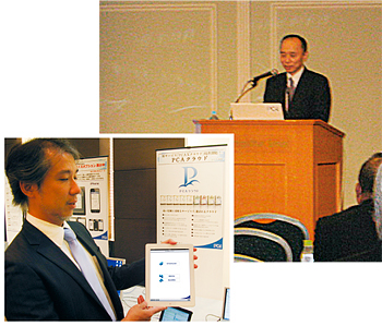 秋の「PCA戦略フォーラム」で、販売パートナーを前に「コラボモデル」の構築を呼びかけるPCAの水谷学社長。(左下は、「PCAクラウド」のスマートデバイス版)