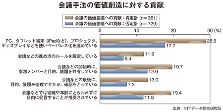 以前から、日本企業のホワイトカラーの生産性は低いといわれてきた。その要因の一つとして、会議が目的を十分に果たしていないことが挙げられる。実際のところ、企業は会議や打ち合わせでICTツールをどのように使い、生産性向上に役立てているのか。会議の手法を価値創造(仕事の生産性向上やイノベーションの創出など)の貢献度合い(肯定/否定それぞれの合計)別にみると、「PC、タブレット端末、プロジェクタ、ディスプレイなどを使ってペーパーレス化を進めている」が、肯定と否定の差が最も大きかった。ペーパーレス化によって、会議の準備や議事録作成の負担が軽くなっただけでなく、資料を事前に配布して最初から本質的な議論ができるようになったからだとみられる。
