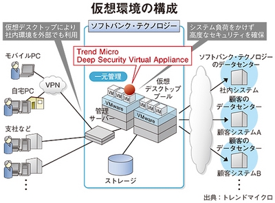 ソフトバンク・テクノロジー(阿多親市社長)は、災害時の事業継続を目指し、社内のクライアント端末300台を仮想デスクトップに移行した。社員が自宅から会社のパソコンにアクセスし、通常通りに仕事ができる環境を築いたのだ。仮想マシンのウイルス対策に、トレンドマイクロの統合型サーバーセキュリティツール「Trend Micro Deep Security」を採用した。エージェントレスでセキュリティを確保するこのツールを使って、仮想環境の安定した稼働を実現している。