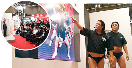 「クラウド EXPO 秋」で、数多くの参加者を集めたブランドダイアログのブース。タレントの長州小力と“大力”の役目をする飯岡晃樹取締役が製品を説明した。(囲み内は、聴衆が120人を超えた稲葉雄一社長兼CEOのブース内でのプレゼンテーション)