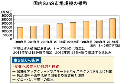 国内SaaS市場で競争が激化している。急成長を遂げる裏で、上位ベンダーによる寡占化の傾向が強まっている。近年はSaaSの年間売り上げが10億円を超えるシナジーマーケティングやブイキューブなどのベンダーが登場してきた。調査会社のミック経済研究所のデータでは、シナジーマーケティングはCRM(顧客関係管理システム)分野でトップシェア、ブイキューブはウェブ会議システム分野でシスコシステムズに次いで2位となっている。どちらの分野も上位2社の占有率は増加傾向にある。生き残りの条件は、変化へのすばやい対応と投資だ。SaaSの販売活動では製品力はもちろんだが、さまざまなパートナーの協力が欠かせない。さらなる事業拡大を狙って、グローバル市場への進出も重要だ。(信澤健太)
