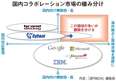 自社イベントで元プロレスラーのアントニオ猪木を起用したサイボウズ。これに対抗したのか、プロレスラーの長州力を模したお笑いタレントの長州小力を展示ブースに投入したブランドダイアログ──。国内コラボレーションツール市場で、勢いに乗る両社の勝負、はた目には活気が漲っているようにみえる。しかし、「危機感の大きさ」でみれば、追われる側のサイボウズのほうが勝っている。同じ市場にいながら、将来の方向性も微妙に異なる。(取材・文/谷畑良胤)