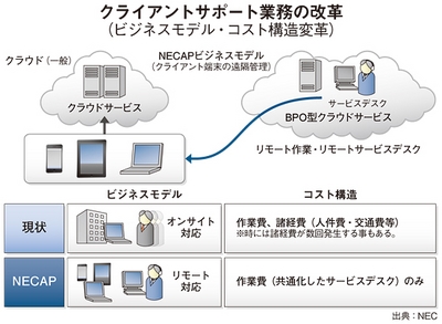 そこでNECAPは、同社や子会社のキャピテックがもつBPO提供用のインフラを大幅に拡充するほか、リモート監視などに必要な人員を増強する。例えば、マルチテナント方式でクライアント端末を管理できる仕組みや、リモートで端末をモニタリングできるクラウド型の海外製品を導入したり、最先端のクラウド技術などを使ってサービスデスクをクラウドで共通化する。サービスデスク環境のクラウド化で同社側の管理コストを削減し、より安価な従量課金制の料金体系でサービスを提供することを目指す。