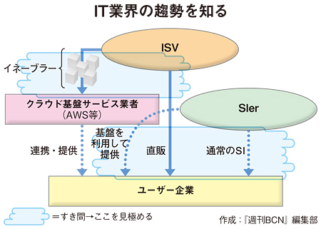 エンドユーザーの利用環境の変化を予測し、ISVとエンドユーザーの間にいるプレーヤー(SIerなど)の存在を見極める。例えば、「desknet's」は、クラウド基盤を提供するアマゾン ウェブ サービス(AWS)上などで稼働するクラウドサービスを展開している。