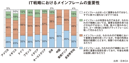 世界では、メインフレームに関して、経営戦略上で「非常に重要である」と答えた企業が32%、「ある程度の成長を見込み、重要である」が49%と、合計で81%の企業が今後も自社のIT計画にとって極めて重要な役割を担っていると考えている。一方で、日本でもメインフレームの重要性を認める割合は高く、とくに企業のIT戦略におけるメインフレームの役割を「非常に重要である」と回答したのが、先進国の中で唯一、50%に達した。