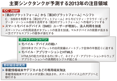 調査会社のIDC Japanが「2013年国内IT市場の主要10項目」と題して、IT産業の構造改革を加速する項目を列挙した。そのなかで、「第2のプラットフォーム」から「第3のプラットフォーム」へのシフトが水面下で加速する、と指摘している。ITインフラは、クライアント/サーバー型から、スマートデバイス、クラウド、ビッグデータ、ソーシャル技術に変化する時代の先駆けになる年と予測する。上記3社に共通しているのは、確実にこの新基盤に向けた製品・サービス、ビジネスモデルを打ち出してきていることだ。「本当の戦いはこれからだ」。ネオジャパンの狩野はそう言って、表情を引き締める。[敬称略]