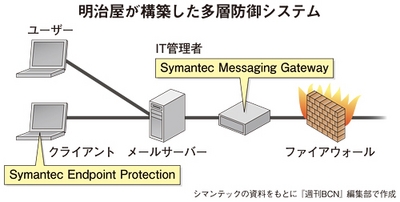 こうした事情があって、明治屋では社員が海外の企業とメールでやりとりする機会が多く、セキュリティ対策に積極的に取り組んできた。ウイルス対策ソフトは、社内でインターネットを利用し始めた当時から導入して、シマンテックの製品をおよそ10年間使ってきた。また、スパムメールやフィッシングなどの脅威からシステムを守る体制の整備にも力を入れてきた。