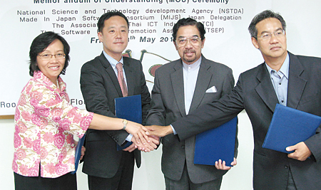 メイド・イン・ジャパン・ソフトウェア・コンソーシアム(MIJS)の「海外展開委員会」でタイを訪れ、MIJSの理事長として、タイのソフト団体とのMOU(覚書)調印式に臨んだ(左から二人目がエイジアの美濃和男社長)