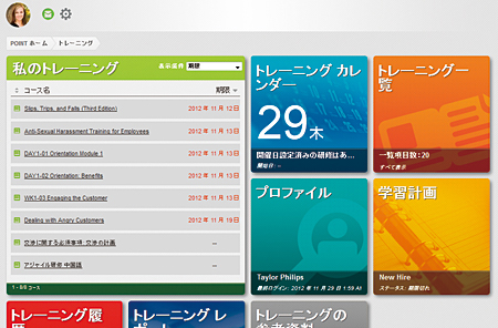 受講者は、個別のポータルから研修日程やその内容、場所を確認する。過去のトレーニング履歴やテスト結果をたどることもできる。WordやPowerPoint、PDF、音声、ビデオなど、さまざまな形式のファイルのインポートに対応しているので、研修プログラムの作成に役立つ。