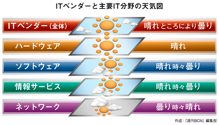 また、12年10月に「Windows 8」が発売され、パソコンの買い替えも促進されることが期待されている。つまり、13年はクライアント端末をベースとしたハードウェアビジネスが拡大することになる。天気図で表わすと、ハードウェアビジネスは「晴れ」ということだ。