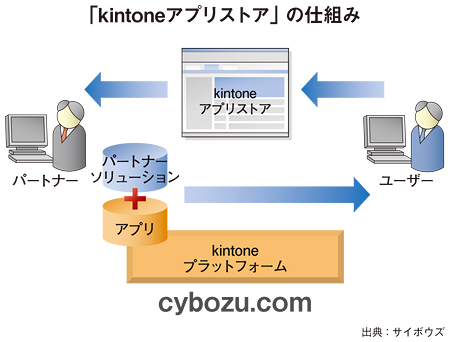 「kintoneアプリストア」は、2012年10月にサイボウズが公開したウェブサイトだ。公開当初、30種類以上の自社開発アプリを揃えた。営業支援(SFA)、ワークフロー、顧客サポート、案件管理、顧客リストなどである。ダウンロード数は無制限で、カスタマイズは自由なのが特徴となっている。12年12月3日時点で、500弱のダウンロードを数える。