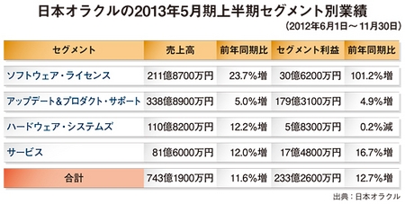「Oracle Exadata」の販売が好調に推移したことを受けて、同製品の機器販売による売り上げを含む「ハードウェア・システムズ」事業は110億8200万円に伸び、前年同期比12.2%増を記録した。さらに、「Oracle Exadata」をベースとしてクラウドやビッグデータの利活用環境を構築するためのミドルウェアやアプリケーションを展開する「ソフトウェア・ライセンス」事業も、「Oracle Exadata」の販売拡大がカンフル剤となり、売上高が211億8700万円に拡大し、前年同期比23.7%増となった(図参照)。
