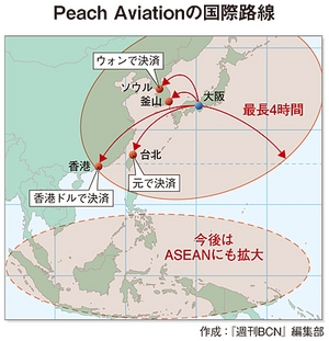 Peach Aviationは事業拡大に向け、路線を東アジアや東南アジアの国々にも広げようとしている。同社が唯一使用している旅客機タイプである「エアバスA320」は最長約4時間の飛行にしか対応していないので、今後、沖縄にも拠点をつくり、沖縄から新たな市場を開拓することを検討している。