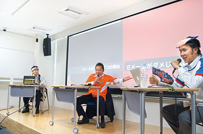 サイバーソリューションズが2012年5月に開催したパートナー総会で、「No!Email vs Yes!Email 打倒G!激論バトル」と題し、パネルディスカッションを開いた。(写真右が同社の秋田健太郎社長、司会を務める『週刊BCN』の谷畑良胤編集長<当時>、サイボウズの青野慶久社長) 同社のクラウド型メールシステムの「CYBERMAIL Σ(サイバーメールシグマ)」などを提供し始めてから、顧客規模は、徐々に大型化。パッケージシステムは、国内500社以上(OEM供給を含めれば1万社程度)に導入されているが、平均すると従業員4000人程度の企業が中心だ。クラウドサービスでは、2万人規模の企業からの問い合わせが増えた。秋田いわく、「大手企業からの要望は、クラウドありきだ」。大企業は、パッケージとクラウドの両方を選択の俎上に載せて決めるやり方をとるという。