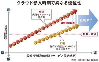 クラウドサービスの提供には、施設の先行投資がついて回る。投資を回収するまでは、単体として赤字が残る。だが、顧客が増えるごとにストックが積み上がる。黒字化してしまえば、競合が参入しても、新規投資が微少で済むので、価格競争で対抗できる──。この筋書きができているからこそ、両社には余裕がある。現段階でベースがゼロならば、クラウドサービスの開始には大きな参入障壁が待ち構えているというわけだ。