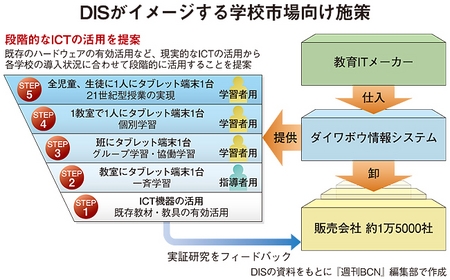 今回、DISが取り組む実証研究は、文科省や教育委員会などが指定するものと異なり、DISが抱える約1万5000社の販売会社と共同で、教育的知見と販売ノウハウなどを高めていくのが特徴だ。土方祥吾・営業推進統括グループマネージャーは、「教育現場に納得の得られる提案ノウハウの蓄積が必要だ。従来は単品だけを提案する形態が多く、学校現場に受け入れられにくかった」と、各教育現場や教育機関の状況に応じてサポートできる販売体制の構築を急ぐことが重要という。