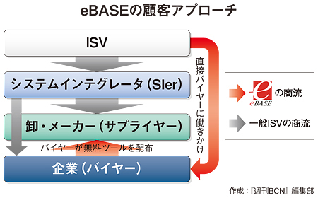 eBASEは、東京、大阪、名古屋を中心に製造業や食品など業界別の説明会を頻繁に開催し、毎回ほぼ満席になるほど人が集まる。 eBASEの市場拡大に向けたアプローチは、他のISVと大きく異なる。通常は、チャネル網を構築して、パートナーがユーザー企業ごとにISVの製品・サービスを提案する。あるいは、直販で顧客にアプローチする。だが同社は、「FOODS eBASE」であれば、生協などのバイヤーを味方につける。そのバイヤーから卸やメーカーに無料の「eBASEjr」を入れるよう働きかけてもらう。eBASEのユーザーは、2012年3月現在で約8万社に達する。このうち98%は無料提供だ。