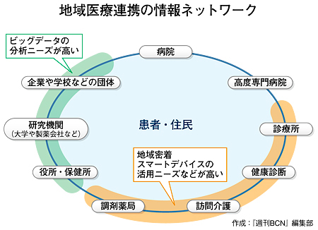 地域医療連携の情報ネットワークをより細かくみていくと、スマートデバイス活用ニーズが高い領域と、ビッグデータ分析ニーズが高い領域に分けられる。地域密着度の高いエリアでは、タブレット端末などのスマートデバイスで、診療や医薬品の処方、介護などといった記録を確認したいというニーズが拡大。一方で、企業や学校、研究機関、役所などは、社会や集団の全体的な健康をビッグデータ分析によって把握したいというニーズが強い。