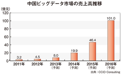 中国のビッグデータ市場が、2016年までに100億元(約1500億円)の規模に拡大する。中国の有力調査会社であるCCID Consultingへの取材で明らかになった。同時期に765億円(IDC Japan調べ)に達すると予測されている国内ビッグデータ市場の2倍の大きさだ。都市化が進んでいる中国では、各市政府が市民向けサービスを強化して大量データの処理に直面する状況にあって、とくに公共セクターでビッグデータ製品の需要が旺盛だ。大量データ処理に適した「PureData System」を展開するIBM中国は「四半期ごとに50件もの契約を結んでいる」(公共セクターの范宇総経理)と、一歩先んじて市場開拓を進めている。中国でのITサービス展開に取り組んでいる日系ベンダーも、その動きをさらに加速することが求められる。(ゼンフ ミシャ)