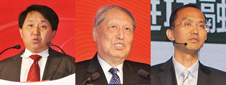 (写真左から)中国IT産業発展研究院 羅文院長、前全国人大副委員長 成思危氏、中国IT産業発展研究院 李峻・副総工程師