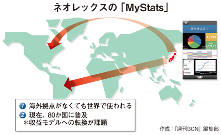 同社は80か国以上で使われているアプリケーションをすでにもっている。2011年4月にリリースしたiPhone向けの自己管理用の無料アプリ「MyStats(マイスタッツ)」がそれだ。自分の活動を記録して、分析するツールだ。英語版もあって、多くの国で使われている。実弟で副社長の駒井研司が発案して開発した。社長の駒井は「日本から一歩も出ていないのに、サービスが海を渡った」と驚く。クラウドストレージのEvernoteなどもそうだが、海外拠点を置かなくてもサービスは世界を駆け巡る。「MyStats」は当初、高額有料販売も検討した。だが、「小さく産んで、大きく育てたい」と無料化へ踏み切った。当然、次の展開を検討中だ。[敬称略]