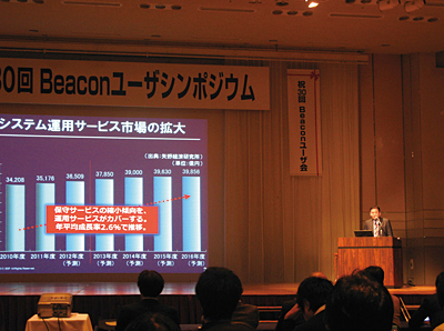 BSPとビーコンITのユーザーイベント「Beaconユーザシンポジウム」で、BSPの竹藤浩樹社長は「運用レス」のコンセプトをじっくり説明した 今年2月、BSPは「運用レス2.0」へバージョンアップを図った。LMISやジョブ管理ツール「A・AUTO(エーオート)、IT部門の変革フレームワーク「ASMO」などに加えて、「運用とクラウドをつないで『運用レス』を実現する基盤」という触れ込みのクラウドサービス「Be.Cloud(ビークラウド)」と運用業務代行を行う運用BPO(ビジネス・プロセス・アウトソーシング)サービスを開始した。