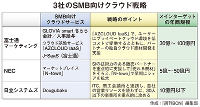 SMB市場向けクラウドサービスの本格的な普及に向けて、ベンダーの動きが活発化している。従来、ハードウェア、ソフトウェアも含めたパッケージ型のSIで案件受注ごとにまとまった額の収益を手にしてきた販社にとっては、単価の安いクラウドサービスは積極的に売りたい商材ではないことが多かった。クラウドのようなストックビジネスは、ある程度ユーザーの数が増えてからでないと「おいしい商売」にはならないからだ。しかし、SMBは、IT投資でのイニシャルコストの負担を嫌うこともあって、クラウドサービスへのニーズは確実に高まっている。ベンダー側もこうした動きは当然理解しており、未整備だったSMB市場へのクラウド販売チャネル構築に本腰を入れ始めた。大手3社の動きを追った。(ゼンフ ミシャ、本多和幸)
