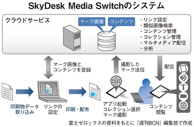 「SkyDesk Media Switch」は、富士ゼロックスの米国関連会社が開発した類似画像検索技術を採用したスマートフォン向けクラウドサービスである。ユーザー企業は、PDFなどの形式で印刷物の画像データをPCに取り込み、クラウド上でリンク情報などを設定する。設定後に印刷物を配布し、受け取った人がスマートフォンで画像を撮影、送信すると、リンク情報が配信される仕組みだ。