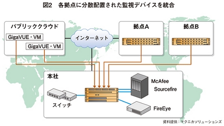 Gigamon機器を設置することによって、ファイアウォールをはじめ、ネットワークに分散された監視デバイスを統合する。多くの監視デバイスから流れるトラフィックを集約し、「パケット通信はどこからきたか、いつ・どこで・何か通ったか」ということを俯瞰的に把握することができる。このように、トラフィックの一元管理を実現することによって、監視の手間を減らすことが可能になるわけだ。