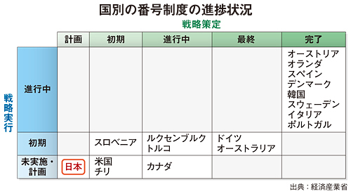 マイナンバーとオープンデータに共通しているのは、日本が完全に「後進国」であるということだ。オープンデータサイトをすでに公開している国は41か国で、オープンデータを推進する国際的なイニシアティブである「オープン・ガバメント・パートナーシップ」には58か国が参加している。米国では、オバマ大統領が1期目就任当初からオープンガバメント(オープンデータ)に関する明確な目標を掲げ、各省庁に期限つきの対応を求めた結果、オープンデータ化が一気に進んだ。一方、マイナンバーについても、上表で示したとおり、日本は欧州、韓国など多くの国の後塵を拝している。