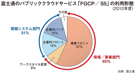 同社は、基盤系の提案に強いが、スマートデバイス活用やCRM(顧客管理)などフロント系に弱い部分があると認識して、急ピッチでフロント系の営業リソースを増強している。ユーザー企業の業務部門を訪問し、ニーズを吸収するプリセールス部隊を、現在の約700人から、1000人弱に増やす方針だ。富士通が力を入れているパブリッククラウドサービス「FGCP/S5」は、2012年度、業務部門での利用が情報システム部門での利用をすでに超えている(図参照)。今後は、ほかの分野でも業務部門から注文を受ける案件をどれほど増やすかが、次世代ICTの売り方を成功させるうえでのポイントとなる。