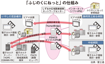 静岡県・川根本町のいやしの里診療所(清水史郎所長)は、富士通の電子カルテシステム「HOPE/EGMAIN-RX」を導入している。電子カルテをビデオ会議システムと連携させて、ほかの病院の専門医がリアルタイムで患者情報を把握し、遠隔診療を行うことができる仕組みを実現している。ICT(情報通信技術)の活用によって、山間部でも町民に高度な医療サービスを提供し、川根本町の深刻な問題である医師不足の解消を目指している。