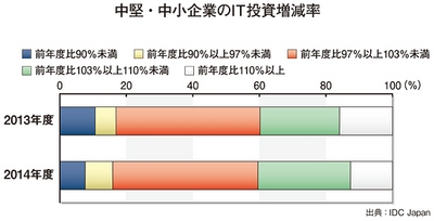 古賀良孝部長 IDC Japanが行ったユーザー企業への調査によれば、従業員数999人以下の中堅・中小企業の39.7%は、「2013年度、IT支出予算を増加する」と回答している。さらに、14年度は、前年度比3~10%程度と積極的にIT投資を増やす企業の割合が高まる見込みだ(図参照)。ここ1~2年、中堅・中小企業は注目すべき市場となる。