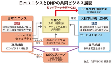 しかし、DNPは2年連続で、印刷需要の落ち込みで売り上げが500億円以上下落している。従来のシステム構築事業が縮小している日本ユニシスも、新規ビジネスによる売上増が急務だ。そんな状況にあって、500億円の共同売り上げだけでは、両社とも本格的な業績回復につながらない。