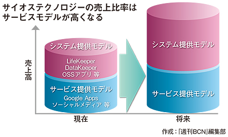 サイオステクノロジーの売上高は、2012年12月期で約60億円。そのなかでウェブアプリケーションやソーシャル関係のサービス事業は1割程度を占める。依然としてエンタープライズ(企業や団体)向けの業務システムが主流だが、サービスモデルが築かれつつある。当面の目指すゴールは単純明快だ。SaaSのような同社サービスを月額従量課金で使うユーザー/IDを100万に伸ばすというもの。現状は数万ID程度だが、視界は良好だ。