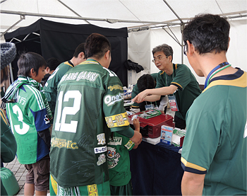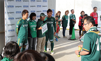 セイコーエプソンの販売子会社であるエプソン販売(平野精一社長)は、日本プロサッカーリーグ(Jリーグ)ディビジョン2に所属する松本山雅FCを、2010年からオフィシャルパートナーとして支援している。7月3日のリーグ戦第22節・水戸ホーリーホック戦は、同社がマッチスポンサーを務めるホームゲームで、年に一度の「エプソンデー」。平野社長もホームスタジアムのアルウィン(長野県松本市)に駆けつけ、さまざまなセレモニーに参加した。平日にもかかわらず7000人以上が集まった地元サポーターとともに、選手の活躍に声援を送った。(取材・文/本多和幸)