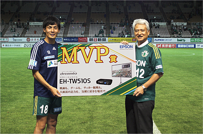 試合は松本山雅FCが2対0で3試合ぶりに勝利。1得点を挙げてMVPに選ばれた楠瀬章仁選手には、平野社長からMVP賞としてエプソン製のホームシアタープロジェクター「EH-TW510S」が贈呈された。