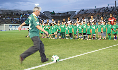 キックオフ前のセレモニーでは、平野社長がピッチにボールをキックイン。思いのほか強烈な勢いでボールが審判に向けて放たれ、会場が大きく沸いた。