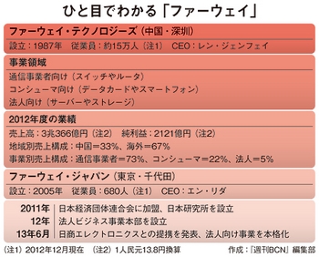 広東省の深センに本社を置き、2012年12月期に3兆円超の売上高を記録したファーウェイ・テクノロジーズは、昨年、サーバー/ストレージを中心とする法人向け事業のグローバル展開に乗り出した。ネットワークの仮想化が進んだことによって、同社の主力製品である通信事業者向けスイッチ/ルータの需要が減りつつある情勢にあることから、法人向け事業を新しい柱に育てることで、中長期的な成長路線の維持を狙う。