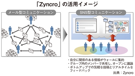 「Zyncro」は、Facebookなどソーシャルメディアのようなインターフェースを備え、文書管理やファイル共有などの機能を盛り込むツールだ。社内だけのプライベートな環境でありながらも、ソーシャルメディアを使うような感覚で、気軽にコミュニケーションをとることができる。